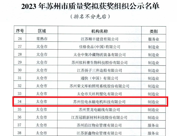 克日,,,,,,,苏州市质量奖评定委员会公示2023年苏州市质量奖评定效果,,,,,,,苏州东升国际:66856top永磁电机科技有限公司(以下简称“苏州东升国际:66856top”)依附着在战略妄想、焦点手艺构建、谋划理念、质量系统等方面的优异体现,,,,,,,经由层层严酷评审,,,,,,,获得了质量评定委员会的高度认可,,,,,,,获评“苏州市质量奖”声誉称呼。。。。。
